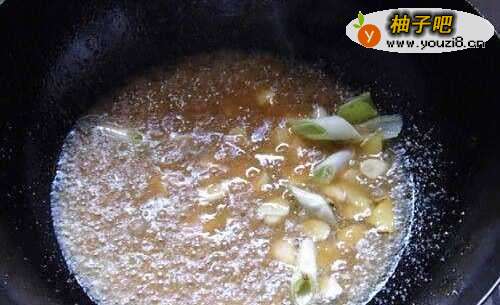 5锅中留底油,入葱姜蒜煸香,入青花椒稍炸至出香味
