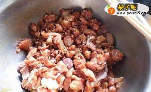 兔肉切丁,加入料酒、盐、淀粉、白胡椒粉和老抽拌匀去腥入味
