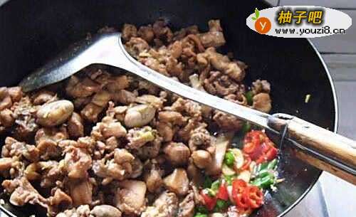 7最后下兔肉,翻炒几分钟,调入适量盐和鸡精,起锅装盘。