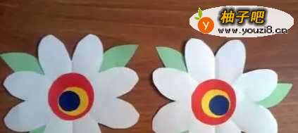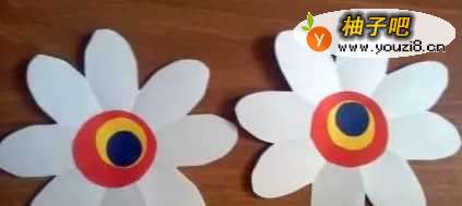 2然后剪一些彩色的大小圆形,按圆的大小依次贴在花的中间,做成花心。