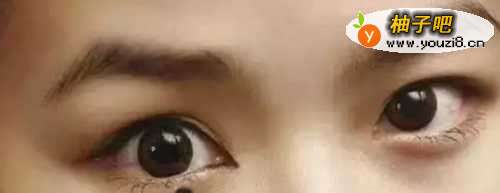 3轻轻地提起上眼睑,确定好着笔的位子,将眼睛分三等份,先从中间开始画,反复描画。