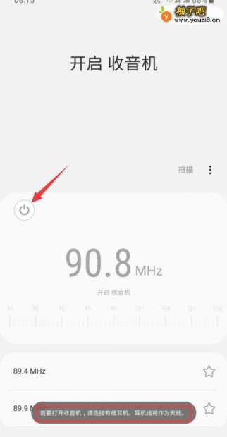 2进入收音机首页后,点击开启收听按钮,会提示插入耳机作为天线,此时将耳机插入手机耳机接口。