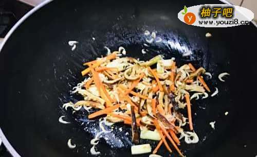 4接着放入虾皮、香菇丝、红萝卜丝炒出香气