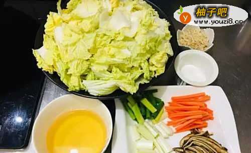 2娃娃菜剥开洗干净,斜切段;红萝卜去皮,切丝;葱切小段,葱白葱绿分开;泡软香菇切丝,香菇水备用;蒜头去头去皮,切末;太白粉加水