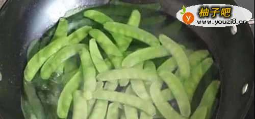 锅中加适量的水,再加入少许食盐和植物油烧开,然后再将处理干净的荷兰豆倒入焯水30秒捞出用清水冲凉备用。