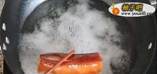 2锅中重新加水,将腊肉放入锅中焯水,加入少许料酒去腥,2分钟后捞出晾凉,然后切成薄片备用。