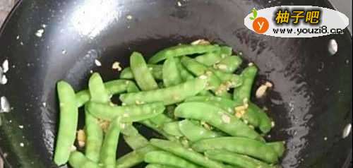 3锅中重新加入适量的植物油烧至四成热,将蒜末倒入煸香,再将焯好水的荷兰豆放入快速翻炒,然后加入蚝油、白糖、鸡精炒匀炒化。