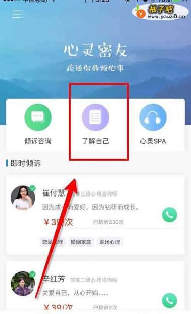 这里显示的“首页”版块,进来就可以看到了,点击紫蓝色的小圆点“了解自己”的上方