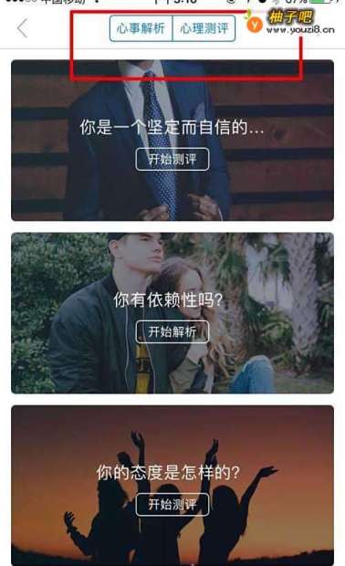 2进来就会看到:“心事解析”,“心理测悦争评”,在下拉目录你有很多测败信摸试题,找到适合自己问题相关的测题。快速找适合自己的,可以点击右上角的“分类”按钮。