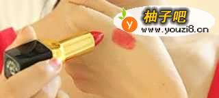 6红艳艳的口红来了。 画在嘴唇中央,樱桃小嘴一样。好有趣哦~