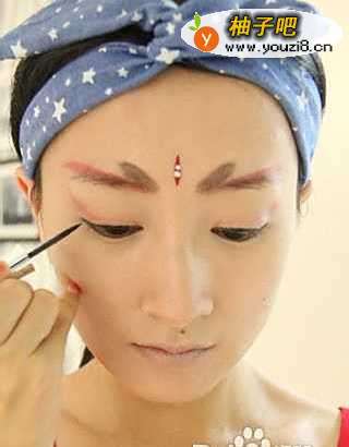 3眼线液画出一条细细的眼线,眼尾稍翘。