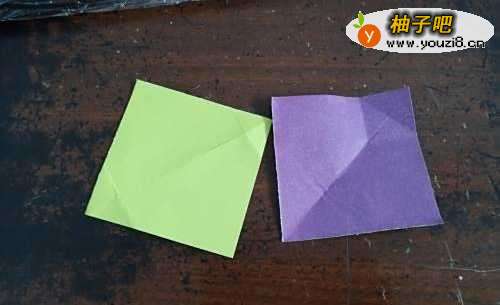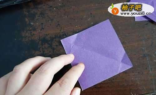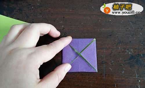 4我们再把另一张彩纸的对角线对折,然后把两侧的边向着折痕对折。