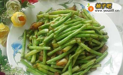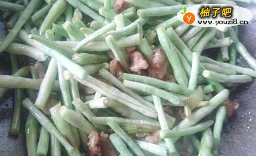 5锅入油预热,下入猪肉翻炒,待肉变色,下入葱花蒜片五香粉继续翻炒,入老抽将肉炒出酱色后,倒入焯过水的菜豆段继续翻炒