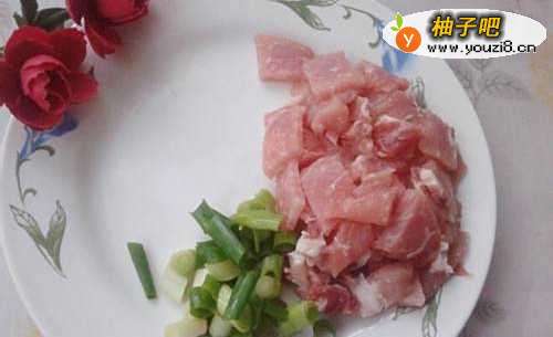 4将猪肉切成细条,葱切葱花,蒜瓣切片备用
