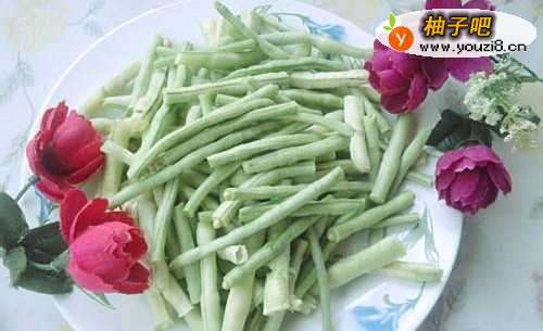 摘取绿色无公害的菜豆,用美工剪去掉根部的蒂巴,去掉有虫眼的部分,在清水中清洗干净