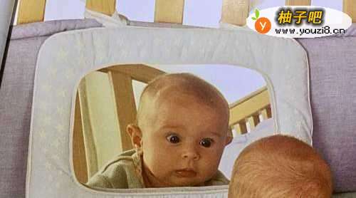 3将宝宝放在婴儿床上,让他看到镜子中的自己。