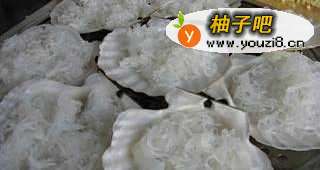 2粉丝用热水焯过,简单切几刀,然后放在贝壳上