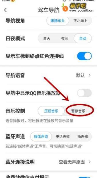 5进入【驾车导航】页面后,上滑屏幕,找到【音乐控制】选项后面的【暂停音乐】点击,即可打开该功能