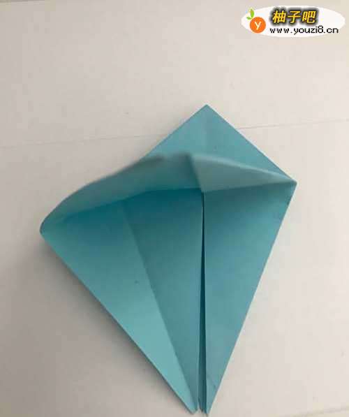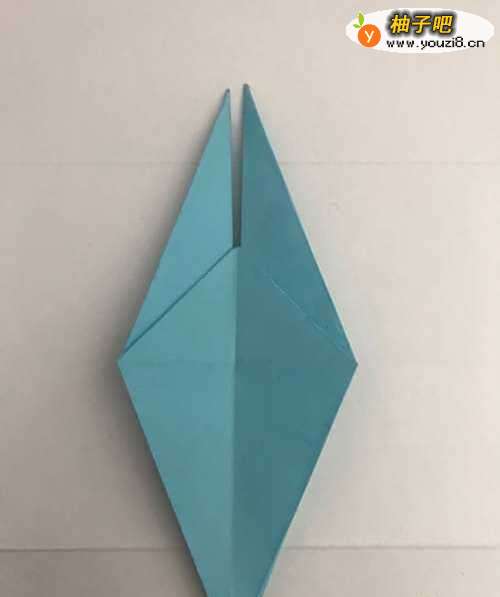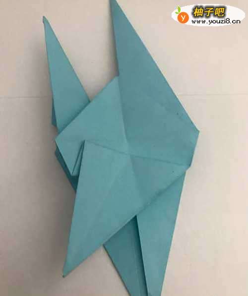 6第六步 都对折好之后 再掀起上层的细节向上折 再斜着向左下折倒 上边的尖角向下折再向右上斜折