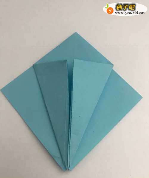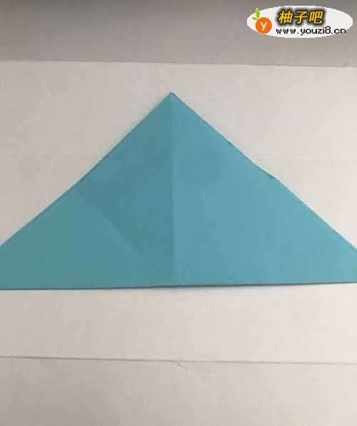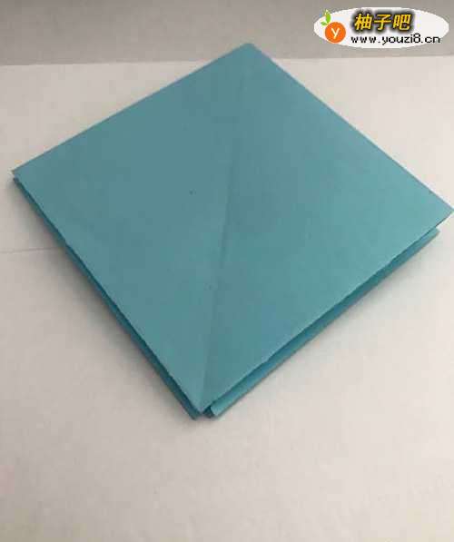第一步 取一张长宽都是16厘米的正方形粉蓝色彩纸一张 先把它从下向上对角折叠 然后把它取开 竖起来折痕 再次从下向上对角折叠整齐