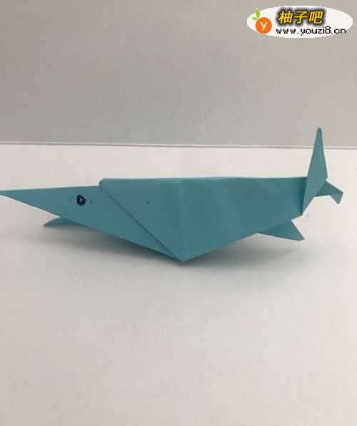 7第七步 上下两个尖角都折好之后 再把它左右对折 然后再给小金枪鱼折上它的尾鳍 再给它画上眼睛 一条可爱的小金枪鱼就折叠完成了