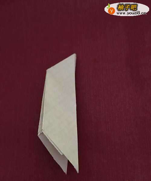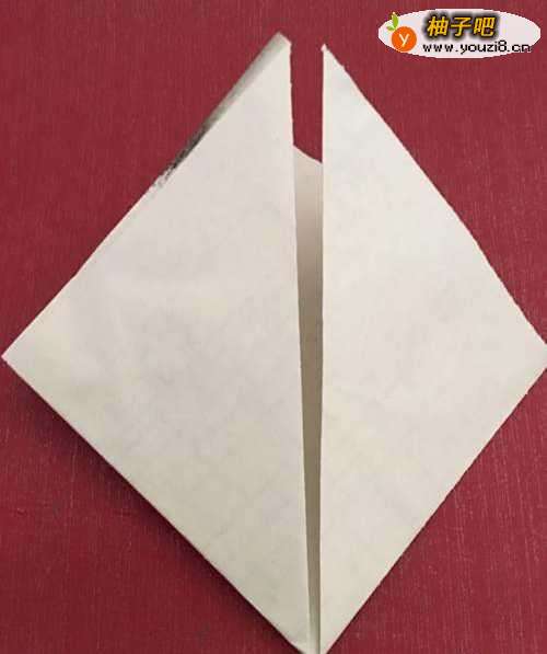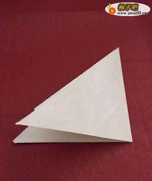 第一步 把一张15厘米X15厘米的白色折纸 从下向上折叠一个三角形 再从右向左折叠一个三角形