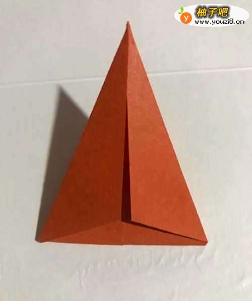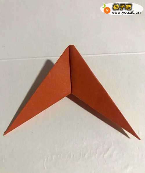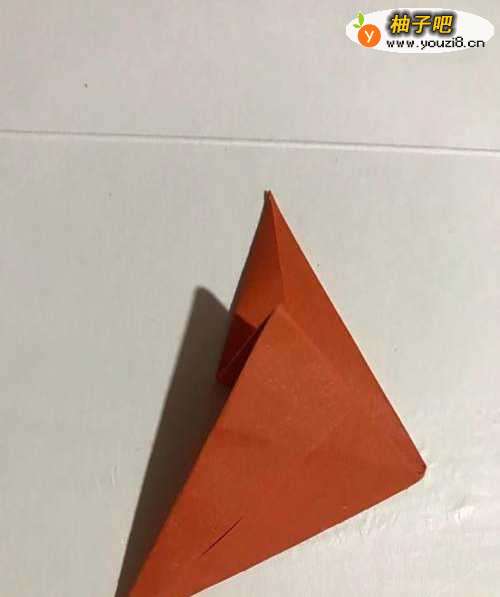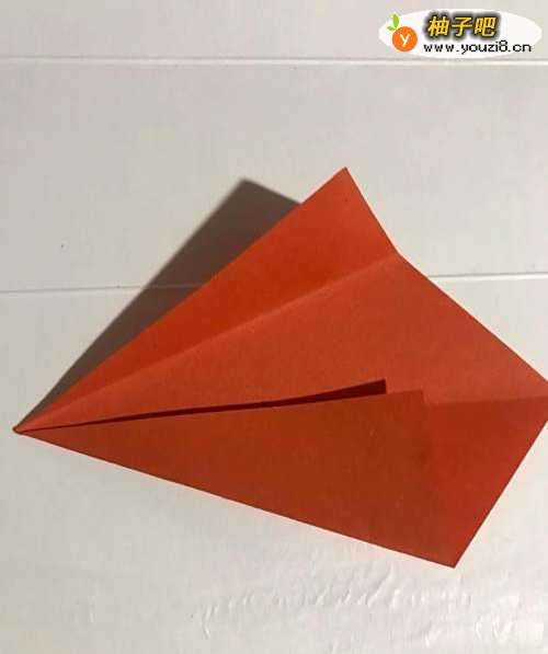 2第二步 两角折好之后 把它大头朝下竖起来 然后再掀起左边角 向中线折倒 右边角同样向中线折倒