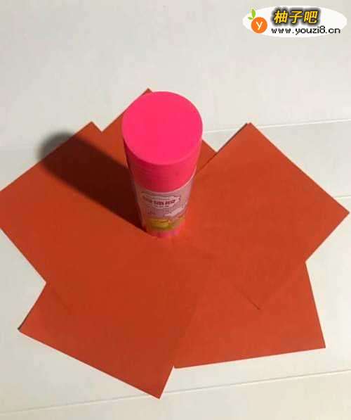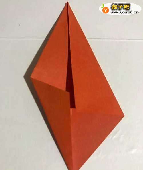 第一步 取一张边长10厘米的正方形红色彩纸 上下对角摆放 然后从下向上对角折后取开 再拿起上下两角对齐中线折倒