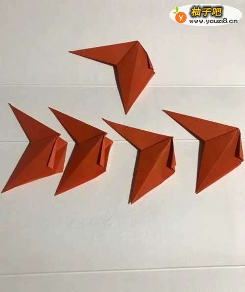 儿童手工折纸 一颗漂亮的五角星 怎样用彩纸折叠拼装 需要材料为正方形彩纸五张 先取一张正方形彩纸 然后折叠出五角星的一个半角 其它四个同样的方法步骤折叠好 最后拼装组合在一起即可