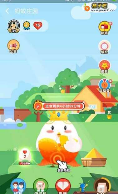 我们登陆蚂蚁庄园后可以看到自己小鸡的状态,我们可以在右上角看到几个功能按钮,我们点击最下面的“运动会”。