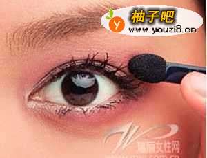 ↑将淡紫色眼影由内眼角向眼尾涂抹,眼尾线可适当拉长涂抹。