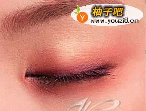 ↑在上下眼睑涂抹紫色眼影,从睫毛根部向眼窝形成渐变的眼影效果。