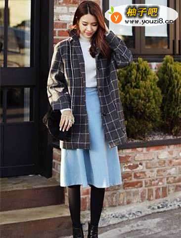 2这款大衣采用了经典的格子图案,加上宽松的版型设计,显得帅气有型,穿出干练气质,内搭白色高领毛衣和浅蓝色半身裙,增添了无穷的女人味,与中性风格的大衣搭配起来别有一番风情。