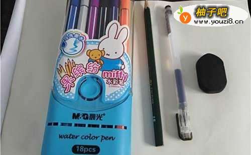 准备好绘画工具,铅笔,橡皮,黑笔,水彩笔。