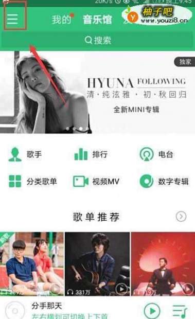 打开QQ音乐,来到了QQ界面,我们点击左边上方的三绿色条,如图所示。