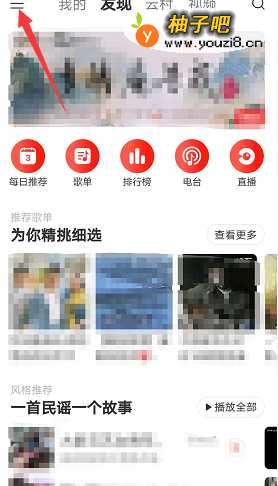 打开网易云音乐。点击屏幕左上方的“三条横线”菜单栏。
