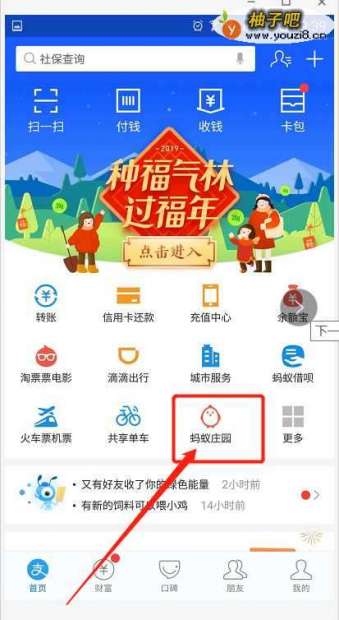 3进入蚂蚁庄园后,点击下面的【领饲料】