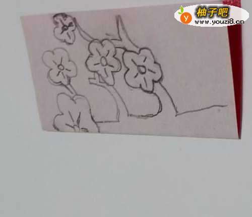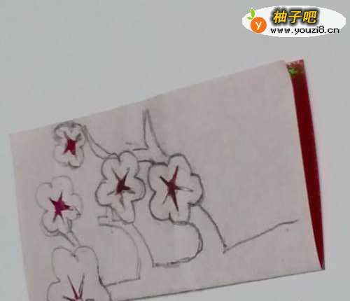 2然后我们在纸上画上梅花的树干,在每个树枝上面画上一朵朵的梅花