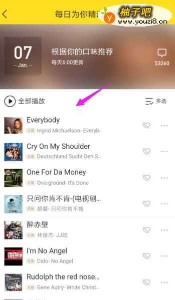 2小编直接舍雁辞把音乐软件触下之后,随意选择一首我们要作为手机彩铃的歌曲了,如图。