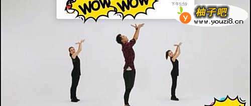 5然后,挥动大臂双手向右打风火轮(左手从最低位向右前方划圆,右手向后下方划圆)--大臂挥动2圈后--右手从腰间掏出高举最高处,左手按掌在腰间--左腿后曳步--回落手。共8拍。其主要动作要领是大臂带动小臂,先要有一个右臂回拉身体上提的预备动作,这样打出的风火轮显得圆满。