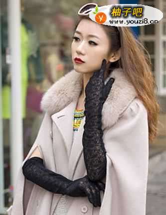 4藕粉色斗篷大衣内搭民族风镶珠领白色呢子连衣裙,蕾丝手套性感妩媚,坡跟短靴是百搭单品。