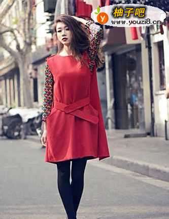 2红色呢裙内搭真丝鱼鳞连衣裙,配拼色坡跟鞋。整套都非常有质感,很有大牌范儿。