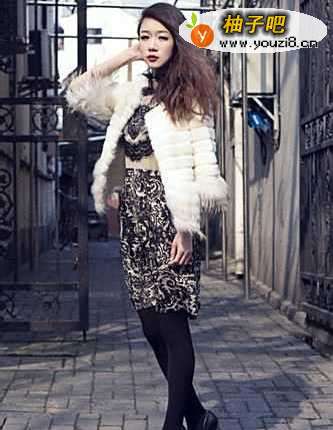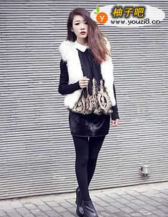 3灯笼款娃娃领刺绣上衣,外搭白色毛毛马甲,下搭鹿绒包臀短裙和坡跟短靴,即使是黑白的一身,视觉效果也很赞。