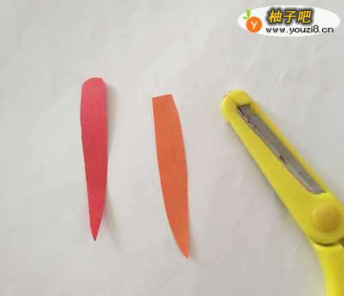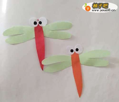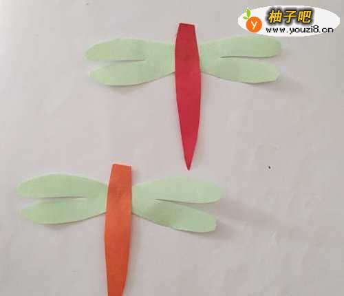 选用红色和橙色的卡纸,剪出蜻蜓的身子,如下图所示。