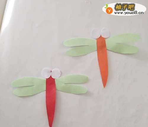 5将圆形的眼睛,涂好胶水粘贴到蜻蜓身子的上方,如下图所示。