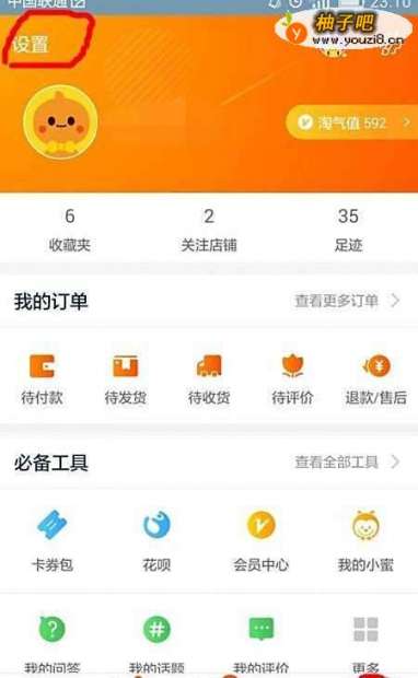 4在“我的淘宝”页面,我们可以看到许多功能选项,在该页的左上角我们可以看到有“设置”选项,我们点击该选项进入淘宝的设置;