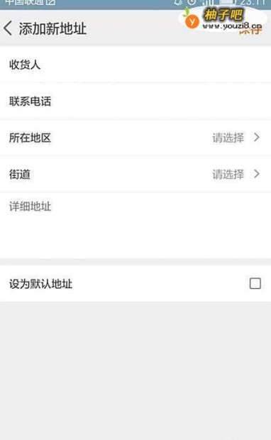 7紧接着进入新地址的设置,我们可以看到需要我们填写收货人、联系电话、所在地区、街道等信息,我们按照提示将这些信息填写好,然后在“设为默认地址”后打上勾,最后点击右上角的“保存”即可;