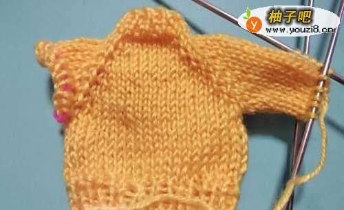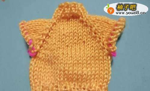 3然后开始分前胸6针、后背6针、双肩个3针,编织时开始加针,每隔一排在前胸、后背、双肩的最后一针的左右各加一针,一只加针到腋下需要的大小,这样就可以看见4条肩线了。