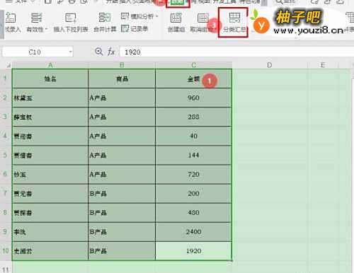 3选择数据区域【A1:C10】,点击【数据】—【分类汇总】;