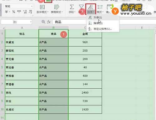 2选择项目数据列【B】,点击【开始】—【排序】—【升序】;
